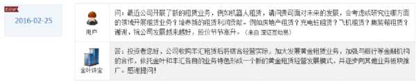 - 2016年12月14日金叶珠宝表示加大发展黄金租赁业务金叶珠宝股份有限公司由于原光明集团家具股份有限公司通过股权分置改革转型上市,是一家集金银首饰设计、加工、销售、回收于一体的珠宝企业.在投资者关系互动平台上表示,公司收购丰汇租赁后将结合经营实际,加大发展黄金租赁业务,加强与银行等金融机构的合作,依托金叶和丰汇各自的业务特色形成一个新的黄金租赁经营发展模式,并逐步向其他业务板块推广。股份有限公司由于原光明集团家具股份有...