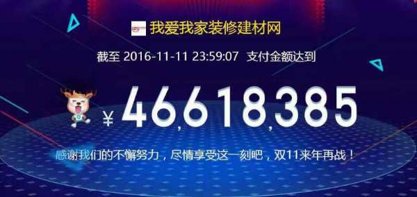 - 2016年12月13日】11月12日凌晨,2016天猫双11落下帷幕。1207亿元的成交额远超去年的912.17亿元。销售额的急剧攀升上演了惊险的速度与激情。其中家装e站在3分钟内就突破了亿元大关,林氏木业29分40秒成交1.5亿,pingo国际在56分钟突破两亿,而顾家家居在1小时30分就突破了去年全天的销售额。在家具、家纺、家装、主材、全屋定制等细分品类中,各家的成绩到底如何?家装主材类:大自然夺得家装主材销售第一...