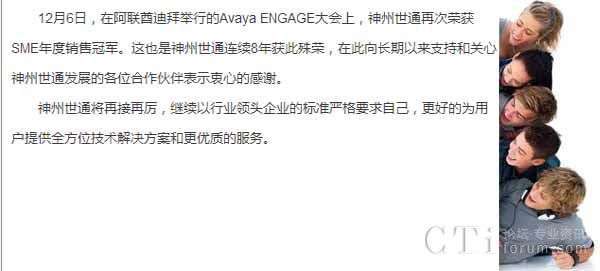 - 2016年12月13日12月6日,在阿联酋迪拜举行的AvayaENGAGE大会上,神州世通再次荣获SME年度销售冠军。这也是神州世通连续8年获此殊荣,在此向长期以来支持和关心神州世通发展的各位合作伙伴表示衷心的感谢。神州世通将再接再厉,继续以行业领头企业的标准严格要求自己,更好的为用户提供全方位技术解决方案和更优质的服务。AvayaSME市场销售冠军奖杯Avaya领导为神州世通颁奖2016年12月5日至8日,Avaya...