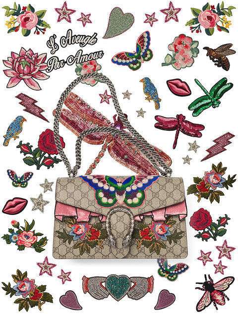 - 2016年12月12日的酒神包――Dionysus系列包包很受欢迎。他们干脆出了个性化定制的服务。从5月25日开始,在米兰的旗舰店,消费者可以在包包上锈上姓名的首字母,选择包包颜色和材质,还可以选择包包上的图案:花卉、嘴唇、蛇、蝴蝶、玫瑰和芍药等等。这些图案都来自设计师AlessandroMichel的设计。除了Dionysus系列手袋,他们之后会把这项服务扩展到Ace鞋、Princetown拖鞋和成衣系列。Gucci...