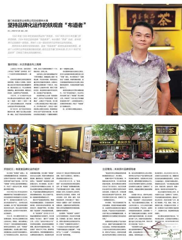 - 2016年12月11日《安溪商人》杂志采访恒品茗茶总经理林水清“商业的未来永远留给那些有清晰战略规划的企业。”厦门有茗堂茶业有限公司林水清总经在接受《安溪商人》杂志的专访时如是说到。9月第八期的《安溪商人》杂志以“坚持品牌化运作的铁观音‘布道者’”为题对话林水清总经理。在安溪的茶企商人中,林水清总经理是把家乡的铁观音茶做成品牌茶中为数不多的一个,其公司旗下的“恒品茗茶”已经发展成为中国知名茶叶品牌,茶叶加盟连锁店已逾两...