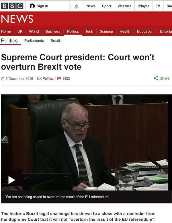 - 2016年12月11日英国最高法院8日表示,将尽快就“脱欧”程序案作出裁决,重点是保证“脱欧”过程合法进行,而不是推翻公投的结果。英国最高法院院长廖柏嘉说,“脱欧”问题引发了争议,最高法院需要充分的时间考虑,并在庭审期间听取各方的辩论和意见。英国最高法院5日开庭审理有关“脱欧”程序案。“脱欧”程序案是由支持“留欧”的一家投资基金经理吉娜·米勒等人向英国高等法院提起诉讼的。英国高等法院上月裁定,政府正式启动“脱欧”程序前...