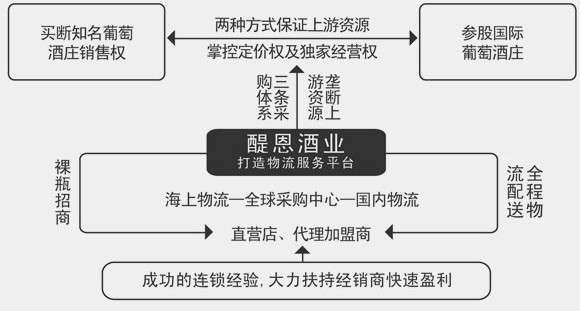 - 2016年12月11日从2008年起,醍恩酒业在法国重资设立分公司、诸多主要红酒原产国设立办事处并在上海设立全球采购中心,通过介入大资本,采用收购酒庄、买断期酒等方式实现了对原产地优质红酒的货源控制,这种大资本介入红酒上游市场的方式,直接保证了红酒的品质、降低了综合费用,实现了醍恩红酒的超高性价比。醍恩酒业在全国打造以醍恩红酒行为核心的原瓶进口红酒连锁品牌,通过与加盟伙伴共享财富的蓝海计划,实现了醍恩品牌的高速扩张和醍...