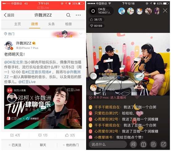 - 2016年12月10日12月5日,新生代人气偶像许魏洲做客由红豆Live与微博音乐联合打造的深度音乐访谈直播栏目“红豆音乐现场”。曾任中国好声音、我是歌手、中国好歌曲等多档节目评委及点评嘉宾的知名乐评人邓柯担当栏目主持,在直播中与许魏洲畅聊音乐、乐队以及做音乐背后的那些事,并对许魏洲提出了很多音乐的指点与教导,令首期栏目有料十足。红豆Live数据显示,直播当天1小时内在线参与人数达到182万人,直播结束24小时内回放量...