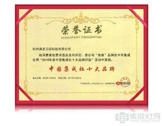 - 2016年12月10日2016年12月6日,由中华集成灶网主办的2016年度“第七届中国集成灶十大品牌”网络评选榜单荣耀揭晓。作为中国集成灶行业的领先品牌,奥普集成灶凭借强大的综合实力,荣获“中国集成灶十大品牌”称号。奥普获此殊荣,我们向厂家表示祝贺!是一家香港上市公司(股票代码HK00477),专注于厨卫电器的研发、生产与销售。奥普集团旗下目前有杭州奥普电器有限公司、杭州奥普卫厨科技有限公司、杭州奥普博朗尼厨卫科技有...