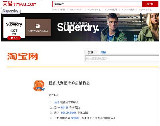 - 2016年12月7日于2015年3月入驻了天猫平台的英国潮流品牌似乎已经悄然关闭了其天猫旗舰店。在天猫平台上搜索关键词Superdry,可以搜索到其店铺,但是点击进入却没有相关的展示任何内容。公开信息显示,2015年3月份起,Superdry与天猫达成合作,开设了天猫旗舰店,所售衣服均提供英国免费直邮。业内人士指出,Superdry显然并不是要退出中国市场。近日,Superdry(极度干燥)就把它在中国的第一家店开在...