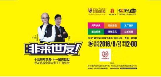 - 2016年12月7日9月来了,十一国庆还会远吗?装修一族们,是时候选购地板啦,近日,世友地板总部将联动全国2000多家门店引爆地板大特惠活动。将不断有好消息放出,消费者可以持续关注!2016年,世友地板成立十五周年。延续世友地板一贯大手笔,大特惠的作风,9月24日和25日两天,世友地板将举办第二季“非来世友”十五周年全国大型庆典活动。届时,著名主持人孟非先生将再次作为嘉宾主持现身重庆和无锡主会场,与消费者见面,同时,...