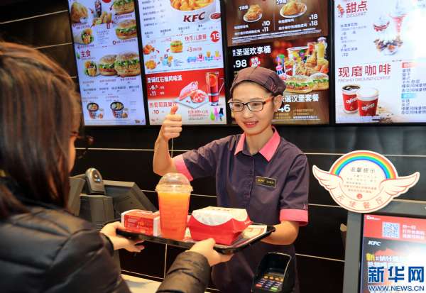 - 2016年12月7日12月3日,听障员工张海燕在为顾客服务,她通过图片和手势与顾客沟通交流。当日是第25个国际残疾人日,浙江首家“天使餐厅”落户浙江绍兴颐高肯德基餐厅。据介绍,这家“天使餐厅”的42名员工中有16名是听障人士。据悉,该餐厅还将作为残疾人就业实训基地,帮助残疾人士实现自我价值。新华社发(袁云摄)...