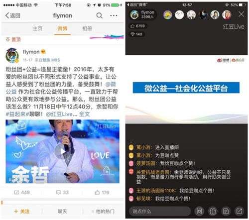- 2016年12月4日11月18日,微博微公益副总监、资深传播人余哲做客红豆Live,通过直播分享了明星粉丝社团如何借助微公益平台更好的助力公益,更举例称赞了TFBOYS、张艺兴、黄致列、许魏洲等明星的粉丝社团在关注贫困儿童、抗战老兵、献血、环保公益等方面付出的努力。明星有极高的知名度,粉丝团更是数量庞大的部落。“粉丝追星”的现象长久以来无法被许多人理解,在他们眼中,粉丝们只是失去理智狂热追星,从买专辑、看演唱会、机场...