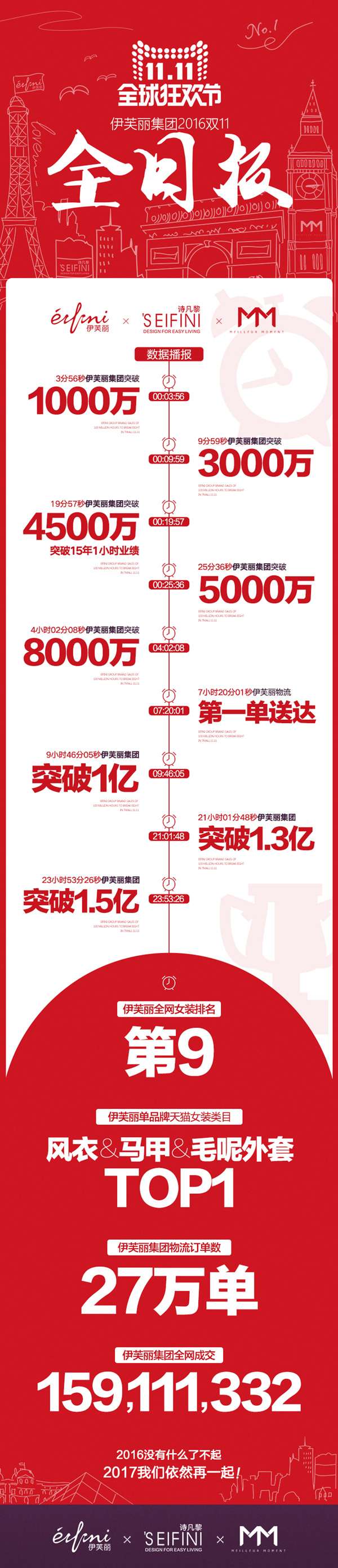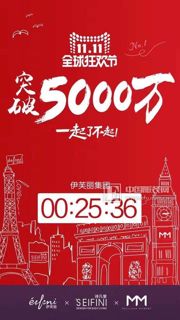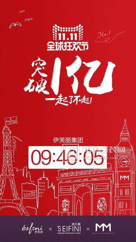- 2016年12月1日消息:时针指向11月12日凌晨零点,2016年双11正式结束,伊芙丽集团最终以1.59亿元的销售业绩收官。其中,集团主打品牌EIFINI伊芙丽以单店单日1.19亿的销售额跻身类目排行榜第9名,该成绩也打破了去年集团双11全天的销售额。值得一提的是,其毛呢大衣、马甲、风衣皆位居全网女装品类TOP1。3分56秒1000万元,9分59秒3000万,25分36秒5000万元......随着双11零点时针一...