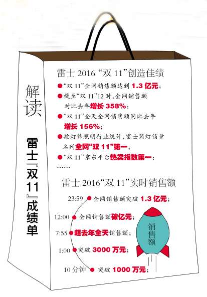 - 2016年12月1日网讯11月12日零点,一年一度的“双11”狂欢购物节结束。今年“双11”再创佳绩,实现全网销售额突破1.3亿元,同比去年增长156%,其中移动端占比高达80%,创造新高度。解密:雷士“双11”成绩背后为备战今年“双11”,雷士集团电子商务公司做了充足准备。雷士电商部门全力奋战“双11”,无论天猫、京东,还是苏宁易购、唯品会,都有雷士电商人的身影。11月10日23时,天猫雷士官方旗舰店预售爆款单品突...