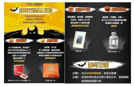 - 2016年11月30日提灯乱窜派糖果,鬼面游行瞎胡闹,在刚刚过去的万圣节,大家的朋友圈是不是被玩鬼屋、化鬼妆、提灯游行给刷屏了?但如果关注欧神诺陶瓷的朋友们除了体验到这些往年常规项目外,今年也跟随欧神诺开发出了各种万圣新玩法。不走寻常路,创意玩法受热捧!欧神诺以“合作创新致远”为核心价值,创新是欧神诺发展以来一直的要求。此次万圣节,欧神诺陶瓷不跟随,结合万圣节搞怪,逗趣,惊悚等节日元素推出“鬼话万圣妖约发声”主题系列活...