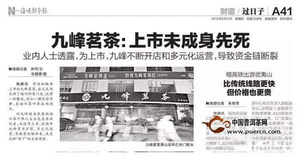 - 2016年11月30日近日,九峰茗茶关门停业的消息在福州业界传得沸沸扬扬,人们在猜测停业原因的同时,一个关乎传统茶业“生死存亡”的问题也摆在许多茶企的面前:传统的茶企商业模式已经越来越不适应当今市场的发展。但是,如何转型升级,也成为业内比较头痛的问题。记者藉由“九峰停业”一事件,解构其商业模式,与业内人士、专家探讨传统茶企,如何在当今的市场环境下,实现转型升级,走出一条适合自身发展的路子。连锁经营是压断资金链“罪魁祸首...