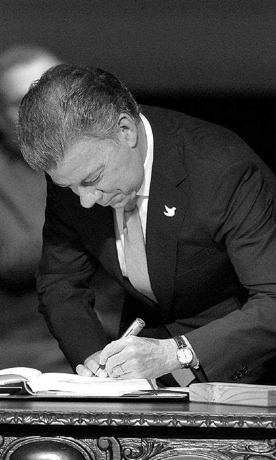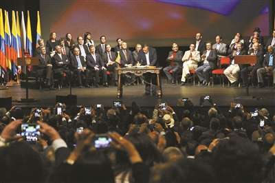 - 2016年11月28日当地时间24日,哥伦比亚政府同该国最大反政府武装“哥伦比亚革命武装力量”(“哥武”)签署新的和平协议。该协议有望结束该国长达半个世纪的内战。新的和平协议不会提交公投,而是直接送请国会批准,因此其通过的可能性极大。此前,双方曾签署过一份和平协议,但在10月的公投中被否决。“这是最终的协议!”美国《纽约邮报》25日报道说,哥伦比亚总统桑托斯在签署新和平协议后高呼。“哥武”领导人隆多尼奥和桑托斯用子弹壳...