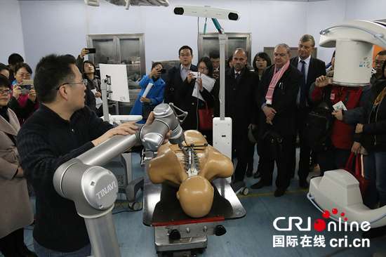 - 2016年11月28日天智航公司市场总监朱荣涛先生向大家演示天玑骨科手术机器人阿尤?约翰逊在参观中提问下一代医疗科技发展的焦点既不是医生的培训,也不是最新的药物,通常这种药物要花费数百万美元才能推向市场。医疗机器人的出现和进步正在改变我们看待世界的方式。这些医疗机器人可以执行复杂的手术,拯救生命,减少病人感染。通过设定好的计算机程序,医疗机器人手臂就可以精确地独立开展手术。北京天智航医疗科技股份有限公司开发的天玑骨科手...