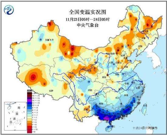 - 2016年11月27日11月24日早,中央气象台解除寒潮蓝色预警。至此,冷空气带来的强降温范围明显缩小,从上周末持续至今的寒潮天气过程划上句点。中央气象台预计,从24日起,淮河以北地区的气温将陆续缓慢回升;而24日广东、广西大部地区气温较23日下降明显,仅有5~12;24-25日,广西、广东、福建、海南等地受冷空气残余势力影响,气温将持续低迷。此外,据预计,未来两天,华南中东部、江南东南部等地的部分地区将有中到大雨,局...