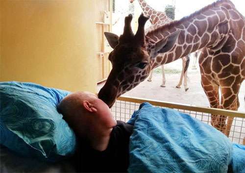 - 2016年11月26日【环球网综合报道】英国《每日邮报》3月21日报道,荷兰54岁的清洁工马里奥(Mario)年轻时大部分时间都是在动物园工作。然而,在癌症晚期弥留之际,他要求医院将他的病床送到动物园长颈鹿区,以便和“熟悉的朋友”告别。只见一只长颈鹿走向马里奥,亲了亲他,似乎在给这个奄奄一息的伙伴一个临别之吻。将马里奥运到动物园的当地救护车希望基金会的创始人凯斯(KeesVeldboer)说道,“这些动物能认识他,也能...