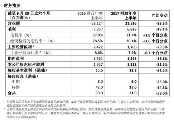 - 2016年11月25日周大福中期业绩全面下滑北京商报讯(记者刘一博实习记者白杨)11月22日,周大福发布截至今年9月30日的6个月的中期业绩显示,集团实现营业额215.26亿港元,比去年同期的281.24亿港元下跌23.5%;毛利率由2016财政年度上半年的78.57亿港元减少至68.28亿港元,下降幅度为13.1%;主要经营溢利由2016财政年度上半年的24.22亿港元下降29.5%至2017财政年度上半年的17.0...