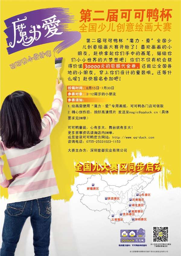 - 2016年11月24日杯“魔力·爱”绘画大赛开始了,全国九大赛区同步启动,30000元现金券等你来拿!的“小设计师”吗?想让全国各地的小朋友都能够穿上自己设计的童装吗?想为孩子的成长添上亮丽的一笔吗?想将30000元的现金券美美地收入囊中吗?那就赶紧报名参加第二届可可鸭杯“魔力·爱”绘画大赛,心有多大,舞台就有多大哦。投稿时间:6月17日-7月30日参赛对象:3-12周岁的小朋友1.去可可鸭各门店领取“魔力·爱”绘画专...