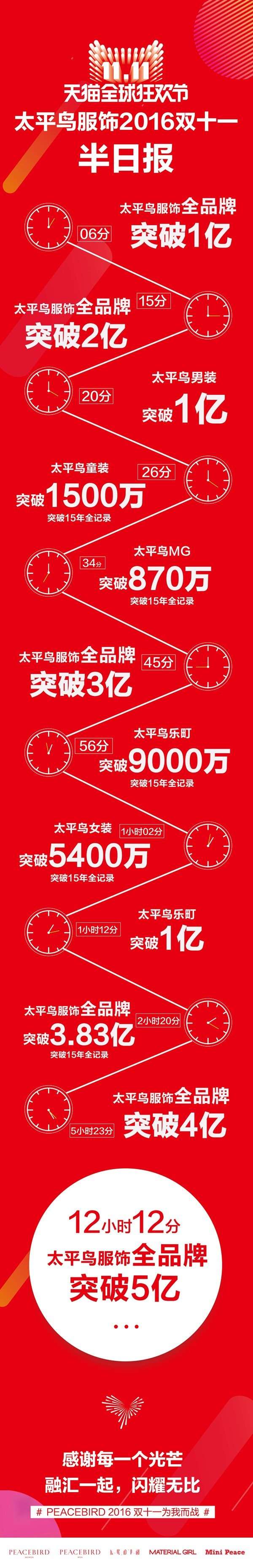 - 2016年11月22日消息:12时12分,突破5亿大关;13时45分,太平鸟破2亿;13时59分,太平鸟破亿。此时,旗下5个品牌已有包括太平鸟男装、太平鸟女装和乐町过亿。“宁波是‘男装大市’,西服、衬衣的产量都是国内数一数二的。进入行业之初,我们也是首选男装。”太平鸟董事长张江平向联商网记者阐述到。而男装,在太平鸟5大品牌中也一直扮演着举足轻重的作用。自2010年首次参加双11,一度排名男装前10。期间,2015年成绩...