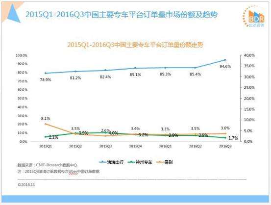 - 2016年11月21日11月17日,中国IT研究中心(CNIT-Research)发布《2016年中国专车市场研究报告》,报告显示,今年三季度,我国专车市场整体规模继续增长。其中,滴滴出行专车活跃用户覆盖率占比达96.7%,订单量市场份额报94.6%,两指标均以绝对优势稳居首位,易到用车、神州专车则分别排二、三名。具体来看,易到用车Q3活跃用户覆盖率达14.3%,市场份额报3.6%,双双小幅增长,而神州专车Q3活跃用户...