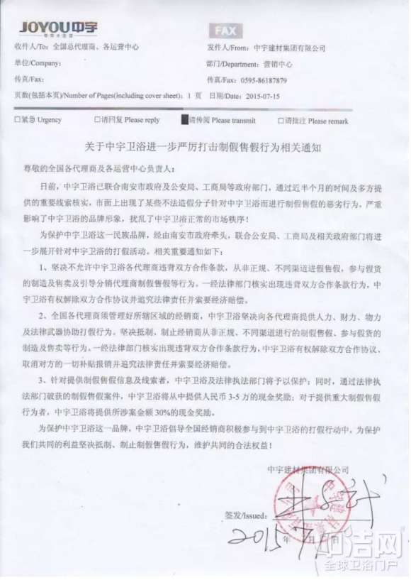 - 2016年11月21日日前,市场上出现的中宇假冒伪劣产品,不仅极大损害中宇卫浴的品牌形象,扰乱市场的正常秩序,而且严重侵害卫浴消费者合法权益。针对此问题,中宇卫浴联合南安市政府、公安局、工商局等执法部门,成立专项打假小组,已于7月14日在南安成功查获一制假窝点,涉案金额达数百万元,相关人员已被刑事拘留,案件正在进一步审理当中。假冒伪劣产品不仅严重损害中宇卫浴品牌形象和消费者合法权益,更亵渎了法律的尊严。中宇卫浴作为民族...