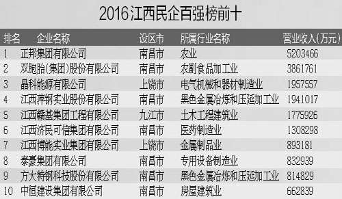- 2016年11月19日中国江西网讯9月28日,省政府新闻办、省工商联主办的“2016江西民营企业100强”发布会在昌召开。记者从会上获悉,正邦集团有限公司以520.3亿元营业收入位居第一,双胞胎集团、晶科能源、江西萍钢、江西赣基集团、济民可信分列2~6位,营业收入均超百亿元。6家民企营收超百亿元据了解,2016江西民营企业100强在420家上规模民营企业调研工作的基础上产生,以企业年度营业额收入总额作为基本指标。今年,...