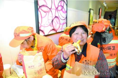 - 2016年11月17日环卫工人开心地吃起了早餐。((湘潭晚报记者王超)11月11日,天还没亮,新华隆肯德基餐厅店经理梁刘姝,就与同事们忙活了起来。一碗热气腾腾的鸡肉粥,一根金黄的油条,一杯温热的豆浆。梁刘姝仔细地把食物分盘、装袋,3个小时后一批特殊的客人将来到这里,享用这些营养而美味的早餐。“入冬后,天亮得更晚了。为了能赶在大家上班前做好清洁工作,环卫工人们通常都是饿着肚子在工作。”原来,这些早餐的主人是可亲可爱的环卫...