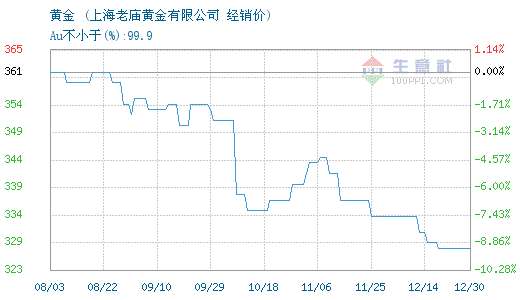 - 2016年11月15日生意社11月08日讯11月08日上海老庙黄金有限公司关于黄金的报价为345元/克。黄金的出产地为上海;黄金的属性:Au不小于(%):99.9。该报价有效期为3天。...