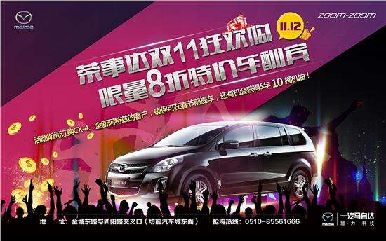- 2016年11月15日你以为双十一是光棍节,NO,双十一是购车狂欢夜,双十一,一年一次;双十一促销,同样也是一年一次!无论是年底促销,还是双十一优惠促销,优惠的心都是一样的。一年一度的购物狂欢盛宴即将拉开帷幕,无锡荣事达马自达4s店购车狂欢购车节活动启动中,限量8折特价车酬宾,本次团购会为2016年最后一波破盘价团购活动,错过一天要等一年,一汽马自达行动,大战双十一,小伙伴们赶快行动起来吧!活动地点:无锡荣事达达马自达...