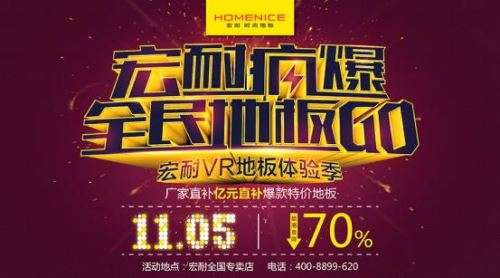 - 2016年11月9日不想回馈消费者的企业不是好品牌,最低降价70%、超值奖品领不停,11月,“宏耐疯爆,全民地板GO”火爆开启,苏皖、鄂、京、津冀、川渝、济南等宏耐全国十大战区同步举行,用一流的品质、三流的价格,让整个阴寒的冬天火爆起来!此次活动是继九月特惠后宏耐推出的又一场惠民活动,是宏耐年终大戏,为了让消费者带着满意回家,宏耐降价幅度让你惊爆眼球,凡活动之前预定的客户,将会享受到每日10元的增值服务,用钱生钱,绝...