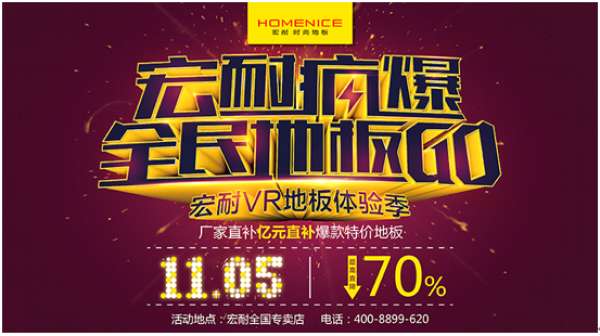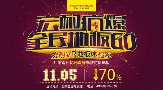 - 2016年11月9日什么能让你感到愉悦?当然是购物,什么能让你感到畅爽?便宜的购物!“宏耐疯爆,全民地板”,超低折优惠让你爽不够,超豪华礼品让你领不停,全国联动,11月,宏耐带你嗨翻天!此次“宏耐疯爆”是宏耐秋冬季打响的最隆重的战役,十一月正是双十一来临之际,为了回馈消费者长久的支持与关注,宏耐倾尽全力给出了最大的优惠,活动形式不仅仅是送礼降价,还有更劲爆的玩法。客户可以在宏耐店面预定价值五十元尊贵用户认购书,活动期...