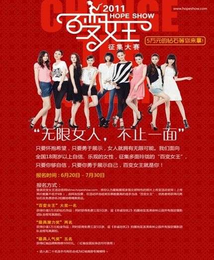 - 2016年11月7日2011Hopeshow红袖“百变女王”征集大赛精彩开启(图)“只要你怀抱梦想,只要你勇于展示,作为一个女人,你就会拥有无限美丽的可能”,2011年6月20日,著名女装品牌“Hopeshow红袖”主办的“无限女人,不止一面”2011“百变女王”征集大赛精彩开启,自信、乐观、心怀梦想的女性们又有了一个展示自我魅力的全新大舞台。成立于1995年的红袖品牌,是杭州市女装开发较早的品牌之一。近年来,红袖服...