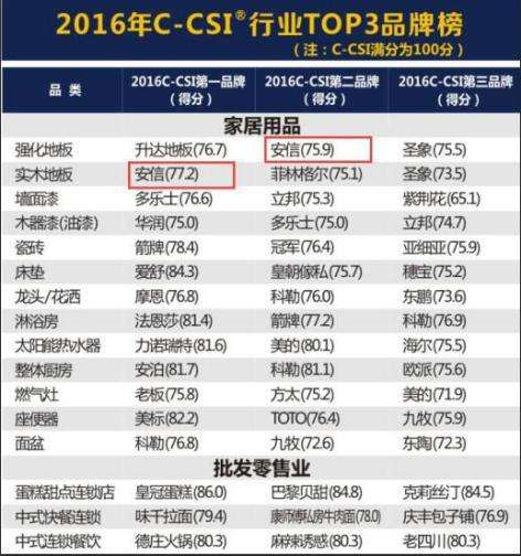 - 2016年10月30日近日,第二届中国顾客满意指数(ChinaConsumerSatisfactionIndex,简称C-CSI)在京发布,凭借在家居服务领域的出色表现,安信实木地板荣获地板行业的消费者满意度第一名,强化复合地板列第二位。对于任何企业而言,客户的满意都是最佳的褒奖,安信荣获2016中国顾客满意度指数第一实木地板品牌,又一次得到消费者与业界的认可。连续畅销,安信地板实木品类“老大哥”地位坚挺中国顾客满意指...