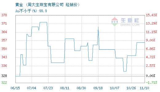 - 2016年10月30日生意社10月24日讯10月24日周大生珠宝有限公司关于黄金的报价为345元/克。黄金的属性:Au不小于(%):99.9。该报价有效期为3天。...