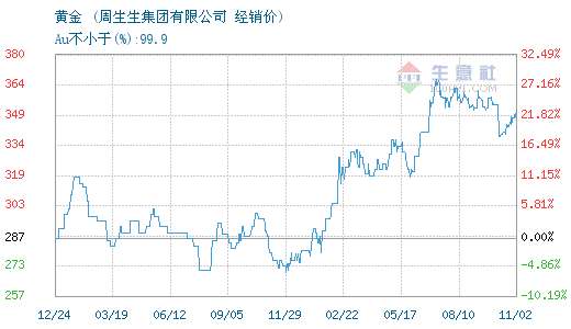 - 2016年10月29日生意社10月27日讯10月27日周生生集团有限公司关于黄金的报价为346元/克。黄金的属性:Au不小于(%):99.9。该报价有效期为1天。...