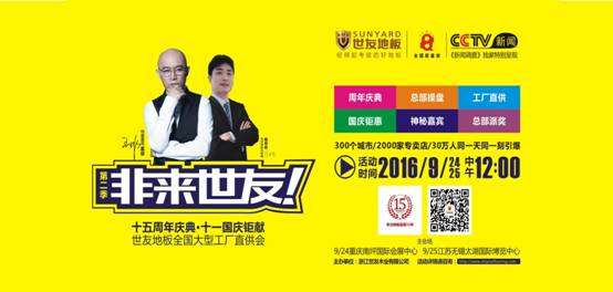 - 2016年10月28日9月24日、25日,世友地板“非来世友”十五周年大型庆典暨十一国庆钜献在全国各地开展。著名主持人孟非老师和世友地板总经理倪月忠一同出现在重庆和无锡主会场,与全国数十万名业主,共同参与此次全国大型工厂直供盛典!9月24日,“非来世友”全国大型工厂直供会重庆站场外9月25日,“非来世友”全国大型工厂直供会无锡站场外9月24日、25日,重庆国际会展中心主会场和无锡太湖国际博览中心迎来万名业主,世友地板“...