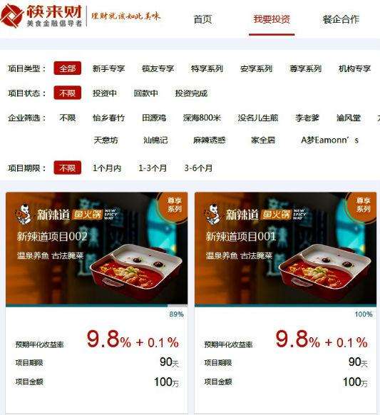 - 2016年10月26日(原标题:谁是你的菜?新辣道联手筷来财推美味理财)鱼火锅第一品牌是谁?想吃梭边鱼你想到了哪个品牌?如今在北京,不会想到“新辣道”的应该是极少数人群!这不,酷暑骄阳的盛夏,新辣道又推新菜品——鮟鱇鱼锅。而在推出新菜品鮟鱇鱼的同时,新辣道还与美食金融倡导者筷来财完成跨界合作,联手推出美味理财产品。7月12日,新辣道食材采购融资项目已经在筷来财平台销售,预期年化收益率为9.8%,周期90天,美食爱好者不...