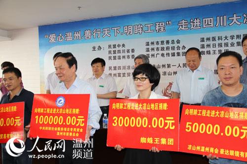 - 2014年5月20日图为爱心捐助现场人民网温州5月20日电一个人,除了生命,没有比光明更重要了。5月20日,在西昌举行的明眸工程再进四川启动仪式上,来自温州的企业和单位纷纷捐献爱心,其中蜘蛛王集团捐助30万元,温州慈善总会捐助10万元,用于帮助大凉山州300多名贫困眼病患者的复明事业。由民盟中央牵头,汇聚温州各界爱心力量,旨在帮助更多贫困眼病患者复明的明眸工程,至今已经在全国12个省市开展爱心活动,共为数千名贫困眼病...