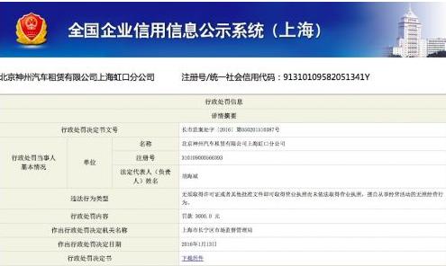 - 2016年2月17日【环球科技报道周涛】近日,北京神州汽车租赁有限公司上海虹口分公司因无照经营领到3000元罚单。此前,神州租车因未经登记冒用有限责任公司分公司名义开展经营活动,被北京市工商局昌平分局罚款1万元。上海市长宁区市场监督管理局称,神州租车自2014年1月起,在上海长宁路以“神州租车中山公园门店”名义对外从事汽车租赁经营活动。截至2016年1月5日停止经营活动,当事人并未取得营业执照。上海市长宁区市场监督管...