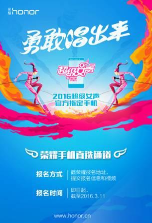 - 2016年2月26日自去年12月31日宣布正式启动,暌违十年之后,2016年,超级女声荣耀回归。前期报名活动反响热烈,日前,超级女声荣耀手机直选通道也乘此热浪,已正式开启。全球互联网手机品牌——荣耀,也借此首度触电荧屏娱乐,为2016超级女声注入互联网基因,共同打造全新的综艺选秀节目。3图:荣耀手机直选通道报名海报即日起至2016年3月11日,点击荣耀官方链接:http://t.cn/RGK6y7y,进入直选通道,填...