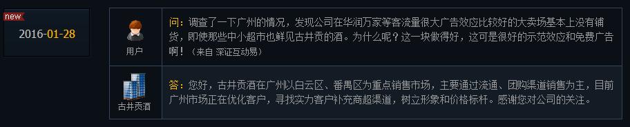 - 2016年1月28日同花顺财经讯1月28日,古井贡酒在投资者关系互动平台上表示,古井贡酒在广州以白云区、番禺区为重点销售市场,主要通过流通、团购渠道销售为主,目前广州市场正在优化客户,寻找实力客户补充商超渠道,树立形象和价格标杆。资料显示:安徽古井贡酒股份有限公司是一家集酒业、酒店业、房地产业、金融业、制药业、高科技等产业为一体的企业。(同花顺财经原创中心)弱势行情怎么保命关注同花顺财经微信(ths518)...