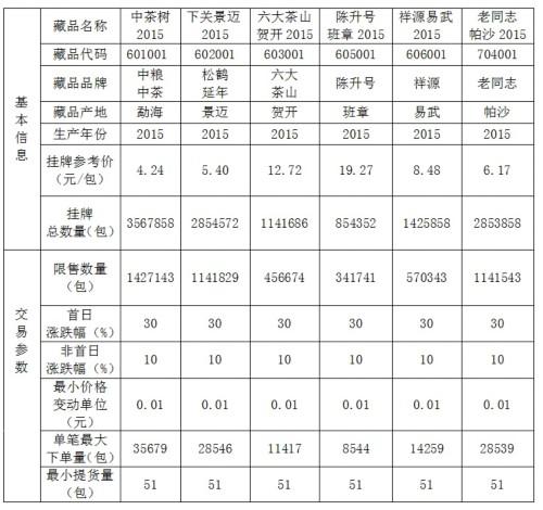 - 2015年12月10日2015年12月09日大圆普洱交易中心发布关于《中茶大树2015》等藏品众筹结果公告。该公告原文如下:大圆普洱交易中心(以下称本中心)于2015年12月7日-2015年12月8日对藏品《中茶大树2015》、《下关景迈2015》、《六大茶山贺开2015》、《陈升号班章2015》、《祥源易武2015》、《老同志帕沙2015》面向所有交易商进行众筹申购,共有6693人次参加了申购,1810万元标的物全部...
