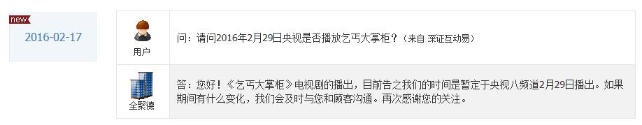 - 2016年2月17日同花顺财经讯2月17日,全聚德在投资者关系互动平台上表示,《乞丐大掌柜》电视剧的播出,目前告之公司的时间是暂定于央视八频道2月29日播出。资料显示:中国全聚德(集团)股份有限公司主营业务为餐饮服务及食品加工销售业务,主要提供以"全聚德"品牌高档烤鸭系列菜品为主的餐饮服务。(同花顺财经原创中心)弱势行情怎么保命关注同花顺财经微信(ths518)...