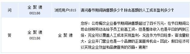 - 2016年2月17日同花顺财经讯2月17日,全聚德在投资者关系互动平台上表示,公司餐饮企业春节期间销售额超过了四千万元,在节日期间公司会按照劳动法给予员工较高工资,但是整体收入也是平日的两到三倍,完全可以覆盖人工成本实现盈利,况且作为节日旺季,客流量较大,企业开门营业也是一个品牌的正面宣传机会。因此,假日经济可以实现企业效益和品牌宣传的双赢。资料显示:中国全聚德(集团)股份有限公司主营业务为餐饮服务及食品加工销售业务...