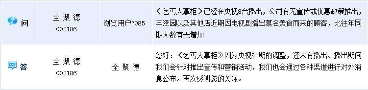 - 2015年12月21日全景网12月21日讯全聚德(002186)周一在全景网互动平台上回答投资者提问时介绍,《乞丐大掌柜》因为央视档期的调整,还未有播出。公司称,播出期间会针对推出宣传和营销活动,也会通过各种渠道进行对外消息公布。公司此前在全景网互动平台上介绍,电视剧《乞丐大掌柜》的题材,是选取的全聚德集团旗下餐饮品牌——丰泽园的故事改编而成。全聚德主营餐饮服务及食品加工销售业务。(全景网)...