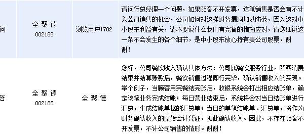 - 2016年1月27日全景网1月27日讯周三全聚德(002186)在全景网互动平台上表示,公司不存在顾客不开发票,不计公司销售收入的情形。公司称,公司餐饮收入确认具体方法:公司属餐饮服务行业,顾客消费结束并结算账款后,餐饮销售过程即行完毕,确认销售收入的实现。举个例子,当顾客用完餐结完账后,收银系统会打出相应结账单,确定该笔业务完成结账;每日营业结束后,系统将会对当日结账单进行汇总,生成结账单据的汇总单;当日的单笔结账...