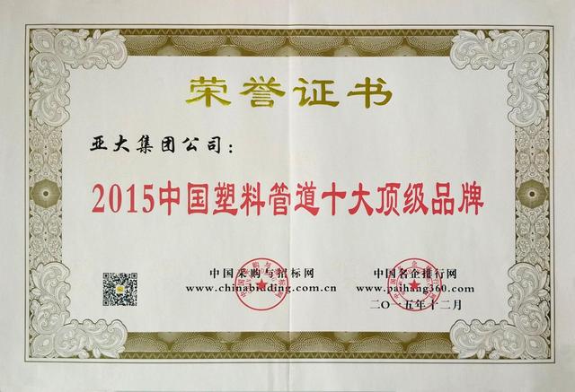 - 2016年1月20日【中国名企排行网】作为塑料管道的标杆品牌,亚大管荣获诸多奖项。近日,由中国采购与招标网和中国名企排行网联合主办的“2015第七届中国塑料管道招标采购评价推介活动”评选活动落下帷幕,经过行业调查、企业入围、网上投票、资料核对、综合评价等阶段,亚大集团公司以巨大的优势荣获“2015中国塑料管道十大顶级品牌”奖项。这是广大消费者对亚大集团公司实力的肯定,更是捍卫领军品牌不可动摇的地位。亚大集团公司成立于...