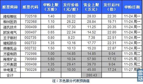- 2014年11月24日新股申购策略札记之十九(维格娜丝、柳州医药、道氏技术等)【新股资讯】:本周共11只新股,其中周一申购新股周四回款可循环申购,本轮全部顶格参与网上申购,最多约需沪市市值56万元,深市市值15万元,所需资金约235.43万元,其中周一发行7只新股,2只沪市,5只深市,全部顶格参与网上申购,最多约需沪市市值15万元,深市市值14万元,所需资金约122.99万元。【投资建议】:行情持续走强及新股中签率走低...
