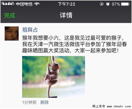 - 2016年2月23日梅花点点千山秀,猴年家家四季春。转眼间,真正的“猴年马月”已经到来,为了给长期关注天津一汽及骏派产品的伙伴们送去一份温暖的祝福,自2016年2月1日起至2月15日,天津一汽在官方微信平台“天津一汽微生活”订阅号上发起了“天津一汽猴年迎春趣味晒图赢奖品”活动,奖品为品牌羊毛围巾、汽车掸子?蜡拖清洁套装,共60个奖品名额,奖品多多,好礼送不停。虽说年末汽车促销活动扎堆儿,但天津一汽本次活动却别具一格,...